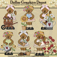 This collection includes six pretty bears, wearing polka dot and gingham dresses, with pretty lace trim, matching headbands, floral hats, a wooden wheel barrow, clay flower pots, pretty red roses, daisies, a sunflower, a little blue bird, metal watering cans, a ladybug, strawberry plants, a little snail, a patch of grass, a picket fence with little heart cut-outs, and a bumble bee. This set contains 6 graphics.