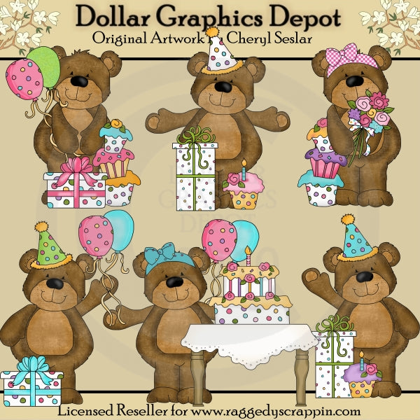 This collection includes six adorable little bears, pretty hair bows, colorful party hats, birthday balloons, decorated cupcakes, with little roses and birthday candles, wrapped presents with pretty bows, a bouquet of flowers, a wooden table with lace tablecloth, and a decorated birthday cake, with little roses and a birthday candle. Colors include: brown, pink, aqua, white, green, yellow, blue, purple, and black. This set contains 6 graphics.