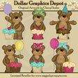 This collection includes six adorable little bears, a party hat, pretty headbands, colorful balloons, and decorated cupcakes with candles, sprinkles, and cherries. Colors include: brown, pink, aqua, white, green, yellow, purple, cream, and black. This set contains 6 graphics.