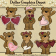 This collection includes six adorable little bears, pretty hair bows and flowers, red scalloped hearts with little stitches, a bouquet of red roses, a pink scalloped heart with little stitches, a pink heart with an arrow through it, a Valentine card in an envelope, and pretty red Valentine hearts. This set contains 6 graphics.