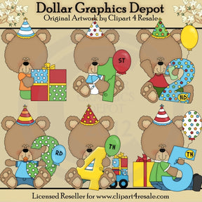 This collection includes six birthday boy bears, with wrapped birthday presents, party hats, birthday balloons, a toy car, and birthday numbers 1-5. This set contains 6 graphics.