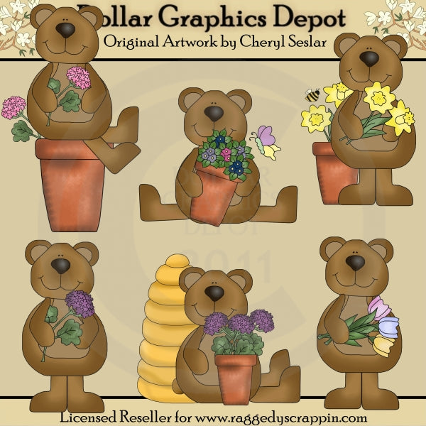 This collection includes six cute little bears, clay flower pots, geraniums, pansies, daffodils, tulips, a beehive, bumble bee, and pretty butterfly. This set contains 6 graphics.