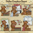 This collection includes six tattered teddies, pretty windows with curtains and star tie backs, beautiful quilts hanging on quilt racks, hanging prim signs for you to customize, a wooden box filled with colorful fabric rolls, a bag of buttons, stacks of multi-colored fabric, jars filled with spools of thread, pretty patterned fabric pieces, old fashioned sewing machines, woven baskets filled with yarn and knitting needles, a spool of thread, measuring tape, scissors, a tomato pin cushion, and a woven basket. Colors Include: green, blue, pink, red, gold, brown, grey, khaki, taupe, tan, black, and white. This set contains 6 graphics.