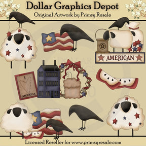 This collection includes prim black crows, sheep with red and blue stars, sliced apples, American flags, a prim candle holder, a bag of red and blue stars, prim sheep, a red and blue prim sign that reads "American," a blue prim house, an Americana picture that reads "I Love America," a prim candle, and a prim wreath with blue stars and red ribbon. This set contains 8 graphics.
