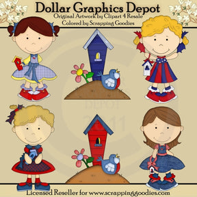 This collection includes four cute little girls, wearing pretty red, white, and blue dresses, with matching hair bows, in blue jean, gingham, striped, and plaid patterns, painted birdhouses, little blue birds, and pretty flowers. This set contains 6 graphics.