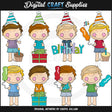 This collection includes adorable little birthday boys with rosy cheeks, colorful party hats, frosted cupcakes with candles, wrapped birthday presents, confetti, a party blower, balloons, and a "Birthday" sign. This set contains 8 graphics.