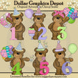 This collection includes six adorable little bears, colorful party hats, a polka dot headband, birthday balloons, a party blower, an ice cream sundae, party confetti, and birthday numbers 1, 2, 3, 4, 5, and 6. Colors include: brown, pink, purple, green, yellow, aqua, black, beige, and white. This set contains 6 graphics.