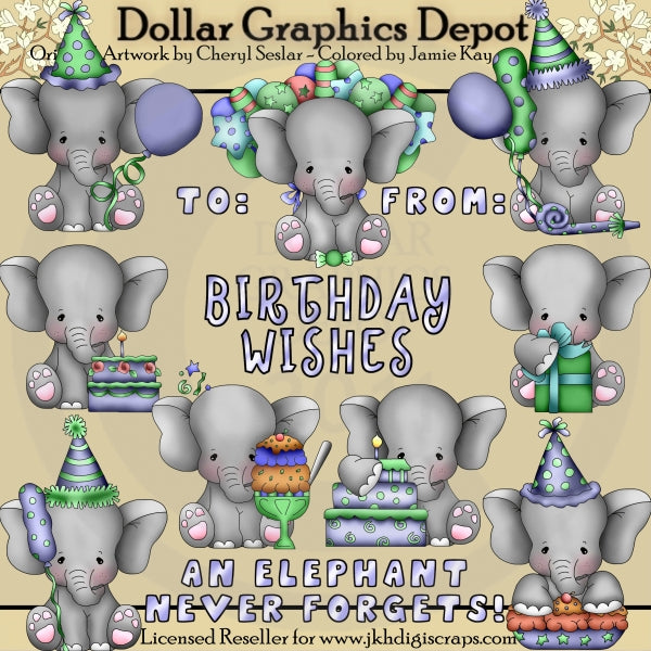 This large collection includes nine adorable, baby boy elephants, with birthday balloons, party hats, wrapped birthday presents, candy, party blowers, decorated birthday cakes with candles, an ice cream sundae, a banana split, and four word art graphics - "To:," "From:," "Birthday Wishes," and "An Elephant Never Forgets." This set contains 13 graphics.