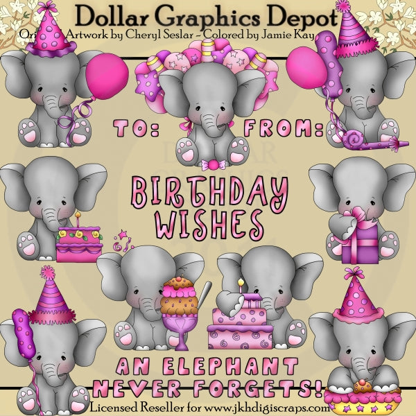 Here are some examples of what you can create using these "Baby Elephant - Birthday Girls" graphics: