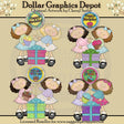 This one-of-a-kind collection is only available at Digital Craft Supplies. This set includes eight birthday friends, wearing pretty little dresses and matching hair bows, colorful birthday gifts in pink, purple, green, and blue, cupcakes with icing, sprinkles and birthday candles and "Happy Birthday" and "Birthday Wishes" party balloons. This exclusive set contains 4 graphics.