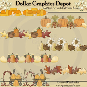 This collection includes seven fall borders - one with candy corn, one with fall leaves, pumpkins, and Indian corn, one with fall leaves, pumpkins, and acorns, one with pears, daisies, and acorns, one with apples, gourds, pumpkins, and black crows, one with colorful autumn leaves, and one with wagons, pumpkins, black crows, oval twig and berry wreaths, and mason jars filled with cinnamon sticks and dried apple slices. PLEASE NOTE: This set coordinates with the "Fall Wreaths" graphic collection. This set contains 7 borders.