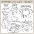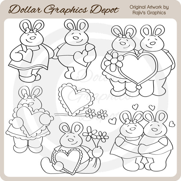 This collection includes sweet little Valentine bunnies, Valentine hearts, and pretty flowers. PLEASE NOTE: This set coordinates with the "My Bunny Valentine - Clip Art" collection. This set contains 6 digital stamps.