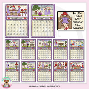 This one-of-a-kind collection is only available at Digital Craft Supplies. This collection includes a pretty 12-month, 2026 Red Hat Ladies Calendar, in two different sizes (4" x 6" and 5" x 7"), with twelve different Red Hat Lady designs and Red Hatter sayings. This exclusive set contains 24 individual printables (12 shown in preview) and 10 "Ready To Print" pages (not shown in preview).
