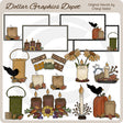 This large collection includes a tin candle lantern with colorful autumn leaves and a black crow, two chunky candles with colorful autumn leaves, a chunky candle with a bag of orange slices and a bag of putka pods, a chunky candle with sunflowers, cinnamon sticks, and pip berries, a candle with colorful autumn leaves, a berry branch, pip berries, cinnamon bun tarts, a bag of cinnamon bun tarts, and cinnamon sticks, a poke candle lantern with colorful autumn leaves and candle tarts, a trio of candles with a colorful autumn floral arrangements, a candle stick with berry branches, and a pumpkin with a black crow, chunky candle, and colorful autumn leaves. BONUS: This set also includes four coordinating, 3.5" x 2" business cards. This set contains 14 pieces - 10 graphics and 4 bonus printables.