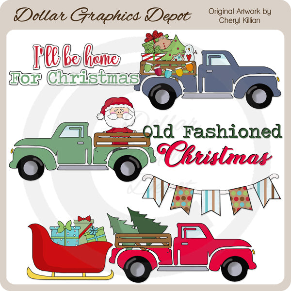 This collection includes three grungy, hallow farm trucks, a decorated Christmas tree, a frosted Christmas cookie, a string of Christmas lights, a gingerbread man, a little snowman, wrapped Christmas presents, Santa Claus, two pine trees, Santa's sleigh filled with gifts, a bunting banner, and two Christmas word art graphics - "I'll Be Home For Christmas" and "Old Fashioned Christmas." This set contains 6 graphics.