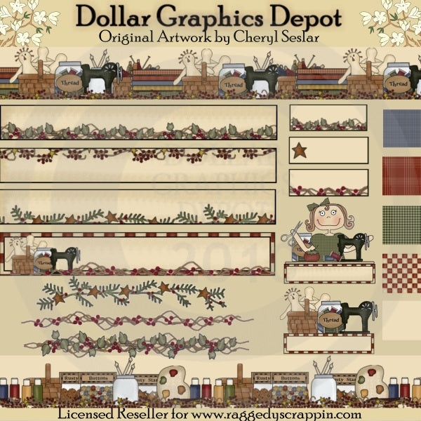 This collection includes everything you need to decorate your own prim, craft website: two logos, four banners, three buttons, three web dividers, two web toppers, and five backgrounds. Some of the images include: a craft lady, old fashioned sewing machines, thread spools, pin cushion, scissors, jars of thread, twigs and berries branches, baskets filled with rag dolls, multi colored fabric, paint, jars of paint brushes, paint pallets, baskets, bags of rusty bells, bags of buttons, bags of rusty stars, baskets of yarn and knitting needles, pine branches with gold stars and berries, and ivy and twig branches with berries. This set contains 19 graphics.