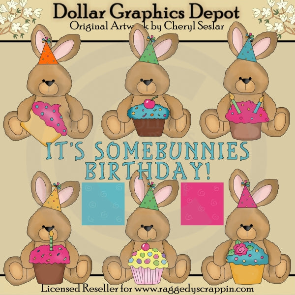 This collection includes six adorable birthday bunnies, colorful party hats, frosted cupcakes with birthday candles, sprinkles, mini candies, a pretty rose, and cherries, one "It's Somebunnies Birthday" word art graphic, and two matching swirly backgrounds. This set contains 9 graphics.