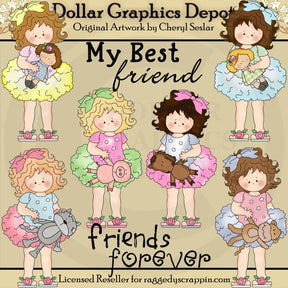 This collection includes six little girls, with polka dot T-shirts, ruffled tutus, floral flip flops, and matching hair bows, two sweet little dolls, four stuffed animals - a kitty cat, piggy, horse, and monkey, and two word art graphics - "My Best Friend" and "Forever Friends." This set contains 8 graphics.
