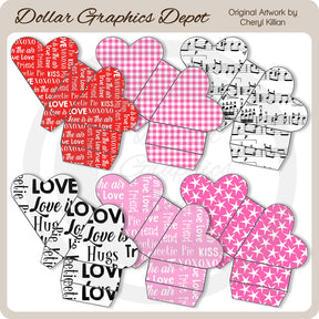 These Valentine heart boxes are perfect for creating personalized keepsakes for family and friends! You can customize them with graphics, photos, elements, word art, etc, and then just print and cut them out. These printables can be enlarged or reduced in size to fit your needs.