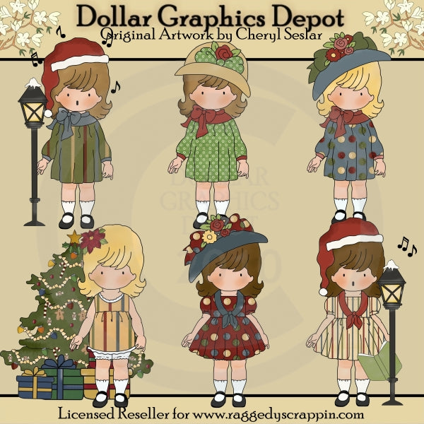 This one-of-a-kind collection is only available at Digital Craft Supplies. This set includes six adorable little girls, wearing pretty striped and polka dot dresses, matching scarves, beautiful floral hats, and Santa hats, in red, green, blue, and gold, snowy lamp posts with music notes, a decorated Christmas tree with gold star on top, wrapped presents with pretty bows, and a book of Christmas carols. This exclusive set contains 6 graphics.