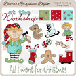 This collection includes a Christmas elf with a hammer, a teddy bear, an ice skate, a doll, peppermint candies, a string of popcorn, a Christmas stocking filled with candy canes, a gingerbread man, a toy train, three coordinating backgrounds, and two word art graphics - "At The Workshop" and "All I Want For Christmas." This set contains 14 graphics.