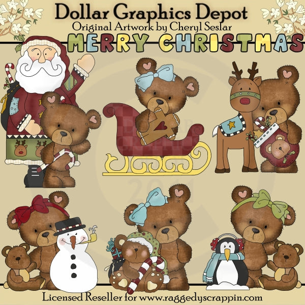This collection includes six little bears, three stuffed teddy bears, Santa Claus with a pretty patchwork Santa suit, Santa hat, and a sack filled with toys, candy canes, and holly berry branches, a Christmas sleigh, gingerbread men, candy canes, a cute little reindeer, a teddy bear Christmas stocking, with holly berry branches and a candy cane, a snowman with a top hat and a pipe, a sack filled with wrapped Christmas presents, a little penguin in the snow, with a winter scarf and ear muffs, and one "Merry Christmas" word art graphic. This set contains 7 graphics.