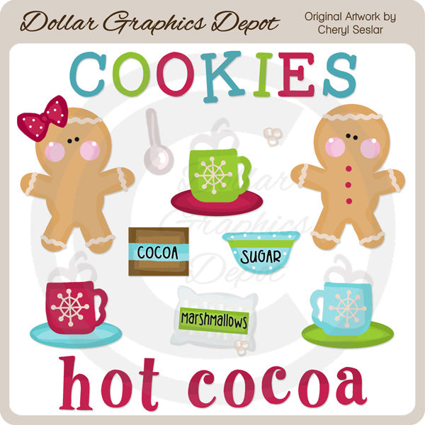 This large collection includes a cute little gingerbread man and gingerbread lady, three hot cocoa mugs and saucers, cocoa, a bowl of sugar, a bag of marshmallows, three marshmallows, a spoon, and two word art graphics - "Cookies" and "Hot Cocoa." This set contains 12 graphics.
