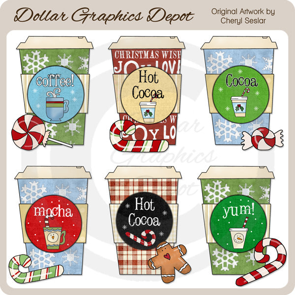 This collection includes six to-go Christmas coffee and cocoa cups - one with a snowflake pattern, a "Coffee" sleeve, and a peppermint lollipop, one with a Christmas word art pattern, a "Hot Cocoa" sleeve, and a candy cane, one with a snowflake pattern, a "Cocoa" sleeve, and a peppermint candy, one with a snowflake pattern, a "Mocha" sleeve, and a candy cane, one with a plaid pattern, a "Hot Cocoa" sleeve, and a gingerbread man cookie, and one with a snowflake pattern, a "Yum" sleeve, and a candy cane. This set contains 6 graphics.