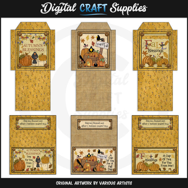 This one-of-a-kind collection is only available at Digital Craft Supplies. This collection includes three standard size, fall tea bag wrappers (these fit Lipton Tea Bags and other brands too), and three 3" x 4" fall bag toppers (these fit the 3" x 4" craft bags). Designs include: fall pumpkins, colorful autumn leaves, bales of hay, black crows, wooden wheel barrels, acorns, "Happy Fall" signs, "Autumn's Blessings" word art, and "Fall Blessings" word art. Text includes: "Tea For You From Me," "A Cup Of Tea For A Fall Day," and "A Cup Of Tea For You From Me!" This exclusive set contains 6 individual printables and 2 "Ready To Print" pages (not shown in preview).