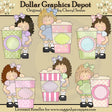 This collection includes six little girls, wearing pretty gingham, plaid, and polka dot outfits, and matching hair bows, and six to-go coffee cups, in polka dot, checkered, and striped patterns, with blank scalloped centers, for you to customize. This set contains 6 graphics.