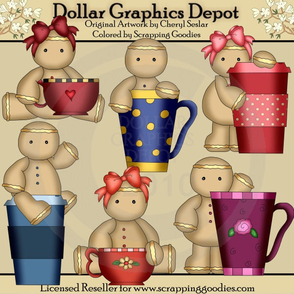 This collection includes three cute little gingerbread men, with icing trim, three sweet little gingerbread ladies, with icing trim and pretty bows, four painted coffee (tea, cocoa, etc.) mugs, and two to-go cups. Patterns include: checkers, polka dots, hearts, and flowers. Colors include: gold, purple, red, white, blue, yellow, green, and tan. This set contains 6 graphics.