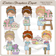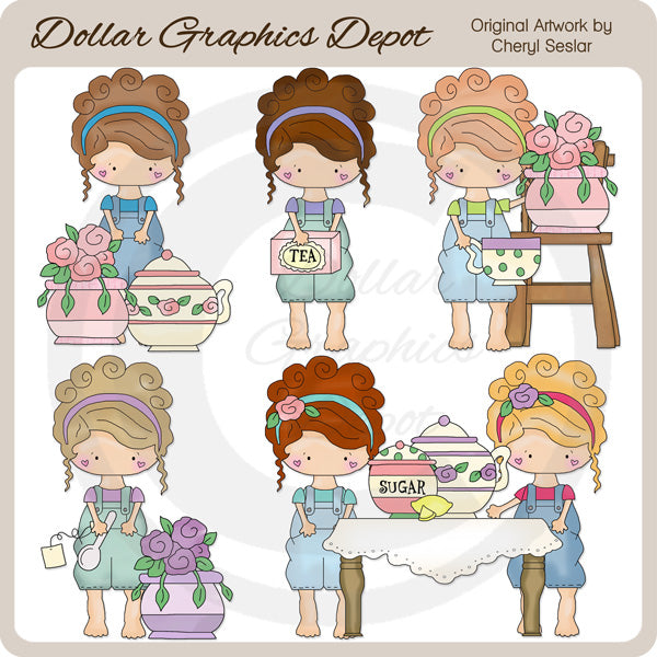 This collection includes six sweet little girls, wearing pretty overalls and t-shirts, matching headbands, floral teapots, vases with pretty flowers, a box of tea, a painted teacup, a wooden chair, a tea bag, a tea spoon, and a wooden table with eyelet tablecloth, a painted teapot, a sugar bowl, and lemons. This set contains 5 graphics.