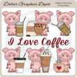 This collection includes adorable little pigs, to-go coffee cups with stirrers, mugs of hot coffee, an iced mocha with ice, whipped cream, and chocolate sauce, a bag of ground coffee, and one "I Love Coffee" word art. This set contains 7 graphics.
