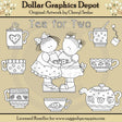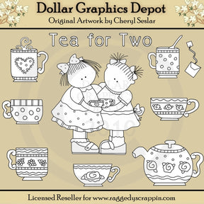 This one-of-a-kind collection is only available at Digital Craft Supplies. This set includes two sweet little girlfriends having a tea party, wearing pretty tea dresses and hair bows, lots of little tea cups with polka dots, flowers, stripes, hearts, and ric rac designs, a pretty teapot, a spoon, teabag, and one "Tea For Two" word art graphic. This exclusive set contains 10 digital stamps.