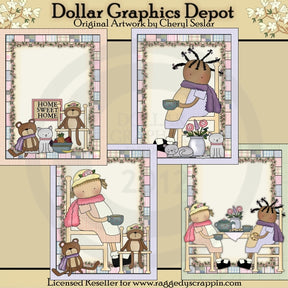 This collection includes four 5x7 tea party card fronts, with pretty gingham, patchwork, and berry vine borders, sweet little girls, kitty cats, stuffed teddy bears, a bowl of fruit, a "Home Sweet Home" sign, a vase with pretty flowers, little wooden chairs, and a tea table with a pretty tablecloth, teapot, teacups, a platter of chocolate chip cookies, and a vase filled with pretty flowers. This set contains 4 cards.