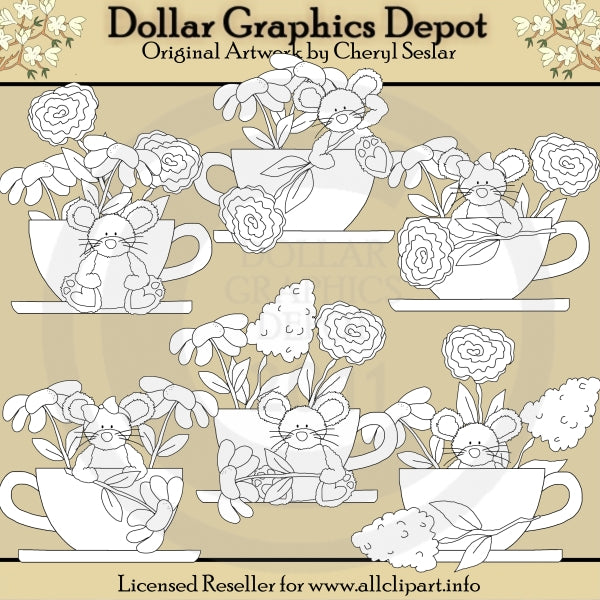 This collection includes six cute little mice, teacups and saucers, and lots of pretty flowers - roses, daisies, and lilacs. This set contains 6 digital stamps.