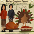 This collection includes an Indian girl, an Indian boy, a turkey with colorful feathers, a fresh baked pie, a roast turkey on a platter, and one "Indians" word art graphic. This set contains 6 graphics.