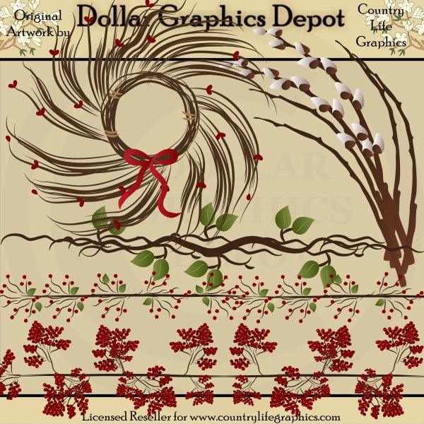 This collection includes a pretty twig wreath with little red hearts and a red bow, pussy willow branches, and three borders - twigs and leaves, twigs, leaves, and berries, and twigs and berries. This set contains 5 graphics.