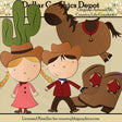 This collection includes a cowgirl with a pretty dress, a bandana, cowgirl boots, and a cowgirl hat, a cowboy with slacks, a long sleeve shirt, a bandana, cowboy boots with spurs, a cowboy hat, and a gun, a horse with saddle, a cactus, and cowboy boots. This set contains 5 graphics.