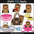 This collection includes six adorable little brown and tan Yorkies, with pretty red bows - one sitting, one standing, one standing with its head turned, and a little red heart in its mouth, one standing inside a little pink box, with a pretty pink ribbon, one sitting inside a designer dog carrier, with a cell phone in the front pocket, one sitting inside a doggy bathtub, filled with water and sudsy bubbles, a retractable dog leash, a fluffy pink dog bed, a dog bowl filled with water, and a dog bowl filled with dry dog food. This set contains 10 graphics.