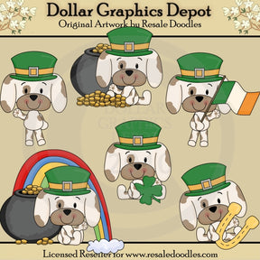 This collection includes six adorable St. Patty's Pups, green leprechaun hats, a golden horseshoe, a colorful rainbow, pots of gold, a green shamrock, and an Irish flag. This set contains 6 graphics.