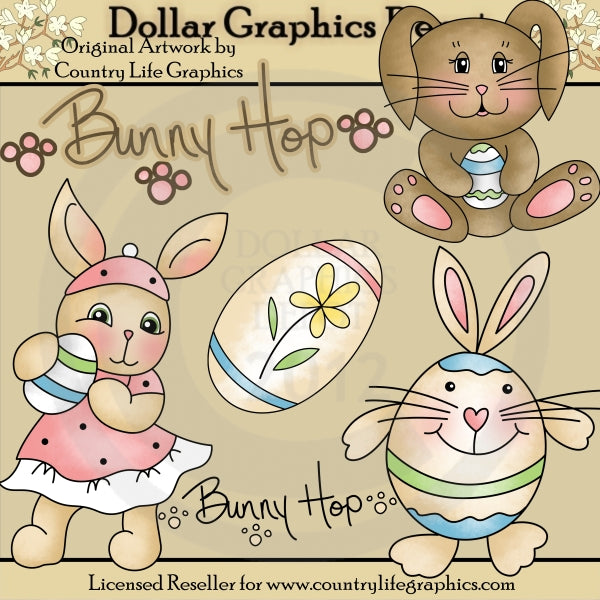 This collection includes a sweet little bunny rabbit holding a colored Easter egg, a bunny rabbit with a pretty polka dot dress, matching hat, and an Easter egg, a cute little Easter egg bunny rabbit, a painted Easter egg, and two "Bunny Hop" word art graphics, with little bunny paw prints. This set contains 6 graphics.