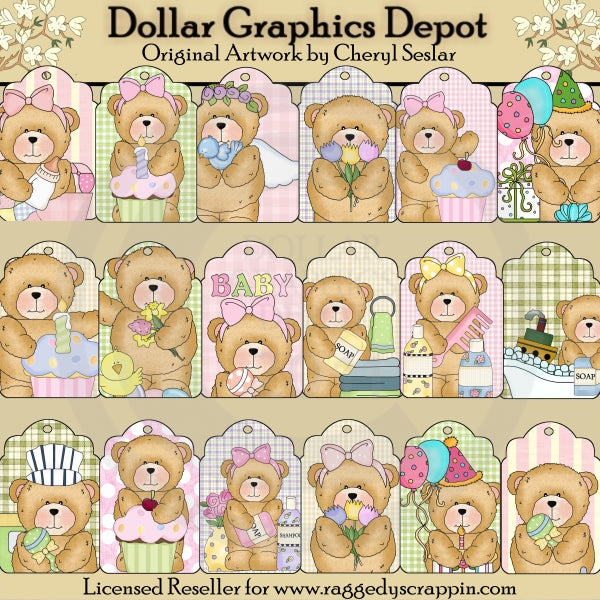 This HUGE collection includes eighteen gift tags, with gingham, striped, plaid, and polka dot backgrounds, in pink, green, yellow, purple, tan and white, with cute little "chubby cubby" bears, cupcakes, party hats, wrapped presents with pretty bows, birthday balloons, a birthday cake with candle, baby blankets, baby bottles, baby rattles, party word art, polka dots, patchwork baby blankets, pretty tulip flowers, a little blue bird, a cute Easter chick, colored Easter eggs, spring flowers, soap bars, folded towels, bath and body bottles, a comb, old fashioned tup filled with bubbles, a bath toy, painted vase with pretty flowers, a conductor hat, and pretty hair bows. This set contains 18 gift tags.