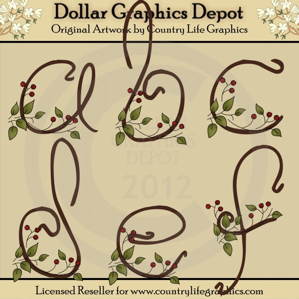 This collection includes twenty six, brown alphabet letters (A-Z) with pretty green leaves and red berries, each in decorative, lower case letters. This set contains 26 graphics.
