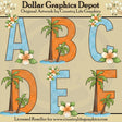 This collection includes twenty six, sky blue and orange alphabet letters (A-Z) with plumeria blooms, the ocean, sand, and palm trees, all in capital letters. This set contains 26 graphics.