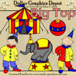 This collection includes two circus clowns, a circus elephant on a prop, a colorful ball, a circus tent, and one striped "Big Top" word art graphic. This set contains 6 graphics.