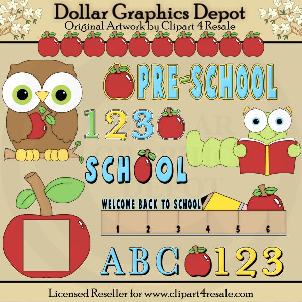 This one-of-a-kind collection is only available at Digital Craft Supplies. This set includes an owl sitting on a tree branch with a red apple, a bookworm with a book, a red apple frame, a ruler with a pencil, a red apple, and "Welcome Back To School" word art, a red apple border, and four school word art graphics - "Pre-School," "123," "School," and "ABC - 123." This exclusive set contains 9 graphics.