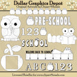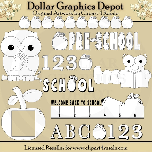 This one-of-a-kind collection is only available at Digital Craft Supplies. This set includes an owl sitting on a tree branch with an apple, a bookworm with a book, an apple frame, a ruler with a pencil, an apple, and "Welcome Back To School" word art, an apple border, and four school word art graphics - "Pre-School," "123," "School," and "ABC - 123." This exclusive set contains 9 digital stamps.