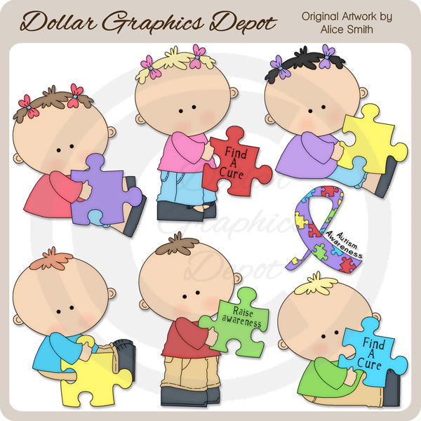 This one-of-a-kind collection is only available at Digital Craft Supplies. This set includes adorable little boys and girls, puzzle pieces - some with the following word art: "Find A Cure" and "Raise Awareness," and one "Autism Awareness" ribbon. This exclusive set contains 7 graphics.