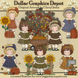 This one-of-a-kind collection is only available at Digital Craft Supplies. This set includes seven sweet little girls, wearing pretty checkered and gingham dresses, and matching hair bows, in orange, brown, gold, blue, and olive green, pretty sunflowers, picket fences, fall pumpkins, autumn leaves, patches of green grass, a metal mailbox, yellow flowers, a wheelbarrow filled with pumpkins, and a beautiful tree with colorful fall leaves. This exclusive set contains 6 graphics.